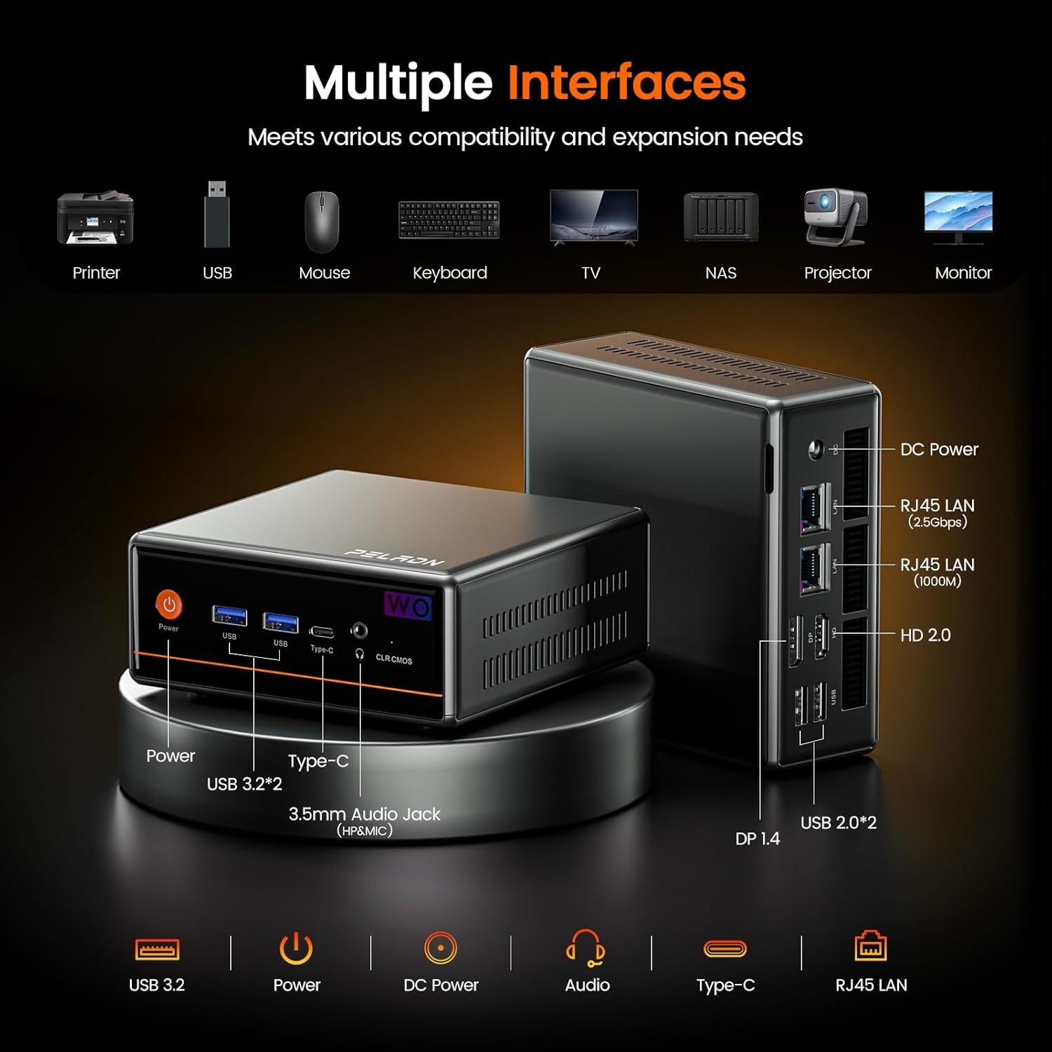 The PELADN WO4 Mini Gaming PC is equipped with a variety of ports, including USB 3.22 (up to 5Gbps/S), USB 2.02, HDMI, Type-C, DP1.4, and a 3.5mm audio jack. These interfaces make it easy to connect external devices such as printers, projectors, and other peripherals. Combined with WiFi 6, Gigabit Ethernet dual RJ45 LAN network connectivity, and Bluetooth 5.2, this mini PC is perfectly suited for both home and office use.
